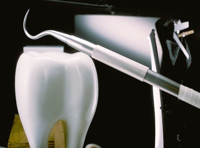 On the set of a Crest commercial where an oversized dental tool was used to remove “plaque” from an oversized tooth.