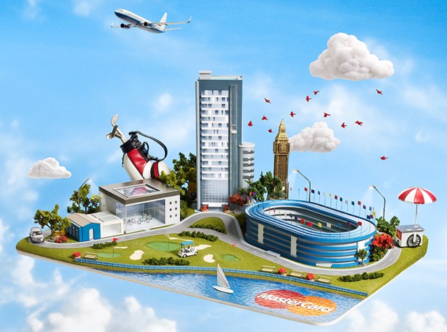 Fantasy Mastercard landscape with male themed icons and merchandise representing “percs” earned when making purchases.