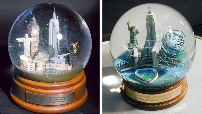 International landmarks fill the snow dome on the left, while New York landmarks occupy the one on the right.